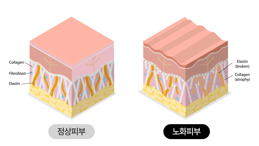 진피층70%를 차지하는 콜라겐은 피부의 철근 역할을하며, 콜라겐 부족시 주름이 생기고 탄력이 떨어집니다.